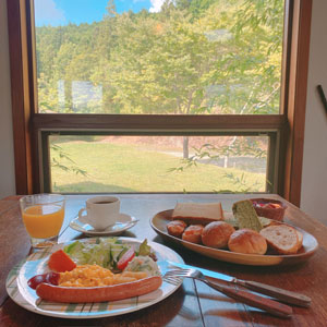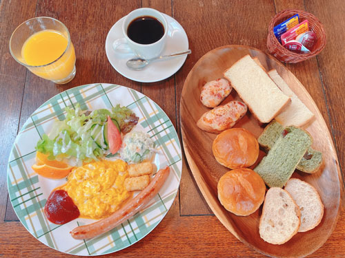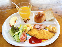 − 卵料理 − 肉料理 − サラダ − フルーツ ◆ パンの盛り合わせ ◆ 牛乳またはオレンジ