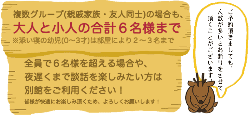 ※お部屋を別々でご予約頂いた場合でも、お知り合いで合計6名様以上のご予約は、お受けできません。
