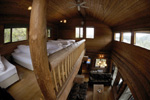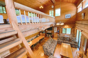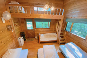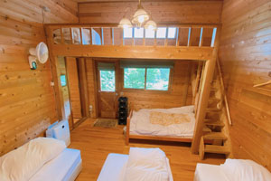 | →リビングダイニングから階段を登ると、吹き抜け横のロフト部にベッドが5台。 階段が急なので大人向き。 | ||