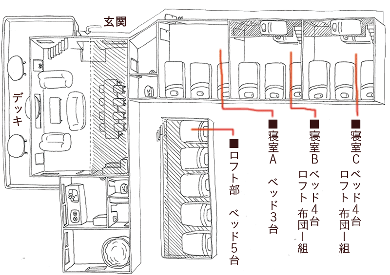 | →ベッドが4台と、ロフト部に布団1組。寝室Aから、または外廊下から行ける。 寝室Aとドアで繋がっているが、施錠して外廊下から入れば個室としても使える。 |